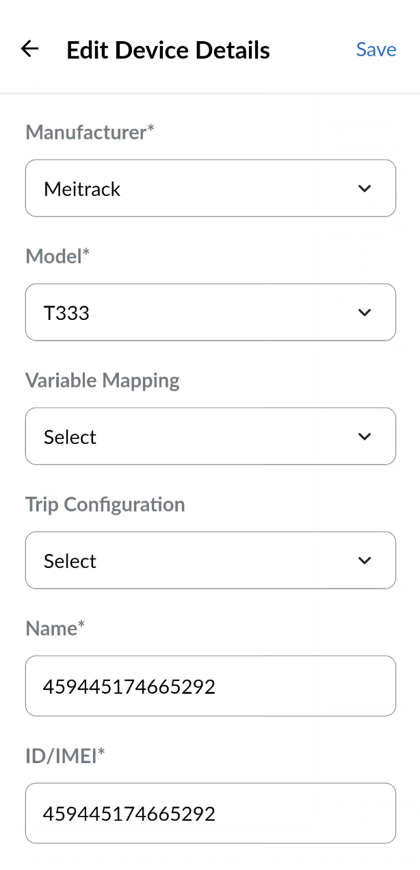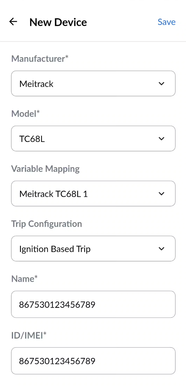 Steps to Create a New Device (*fields marked with an asterisk are mandatory):- Select the Device Manufacturer* - Choose from commonly used tracking device manufacturers such as Meitrack, Ulbotech, and others.