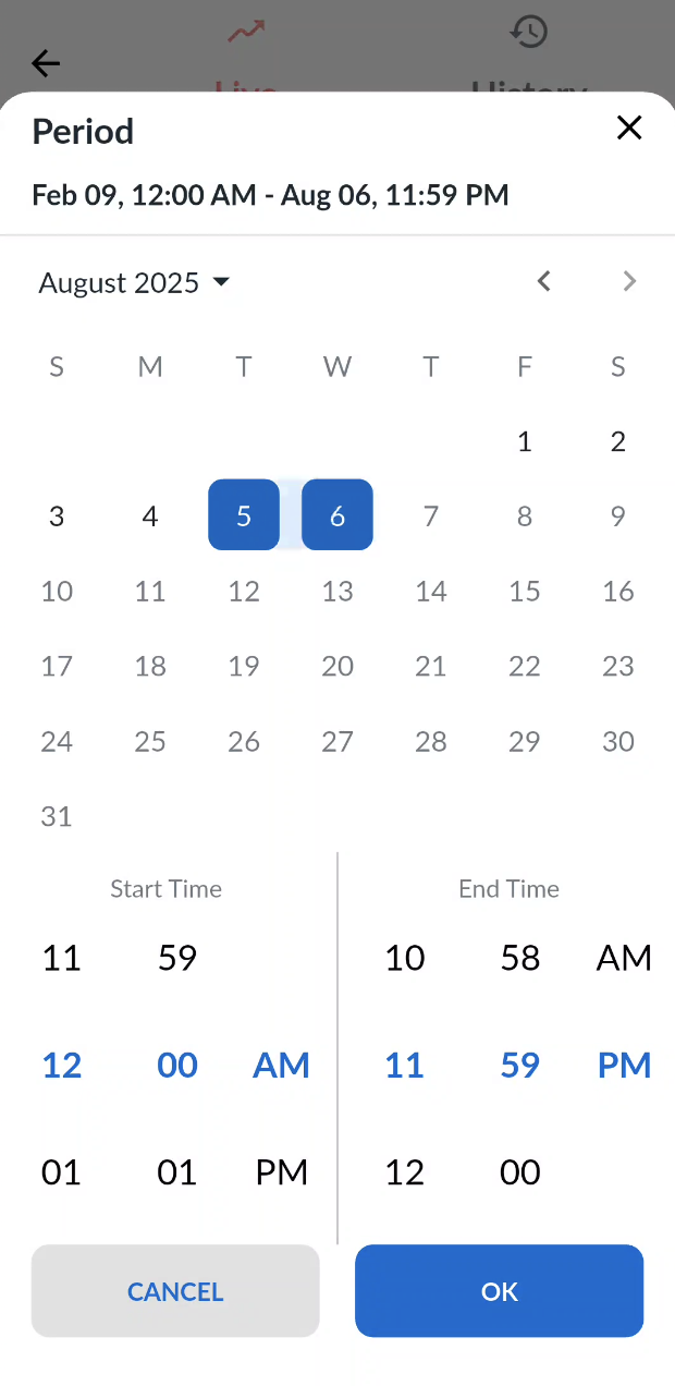 - Tap on the date time field to select the desired date and time range from the calendar (you are allowed to select a date range within one week).