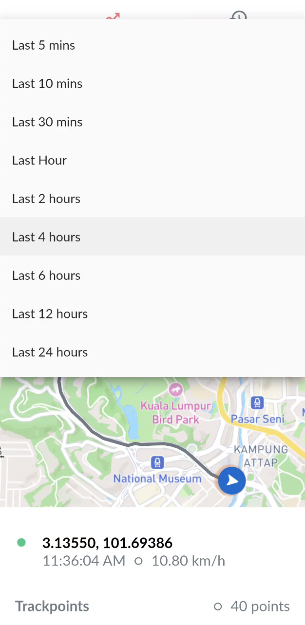 Live Tracking displays your vehicle’s current location on an interactive map, updating in real time. It also allows you to view recent historical movement—ranging from the last 5 minutes to the last 24 hours, so you can quickly assess short-term travel patterns.