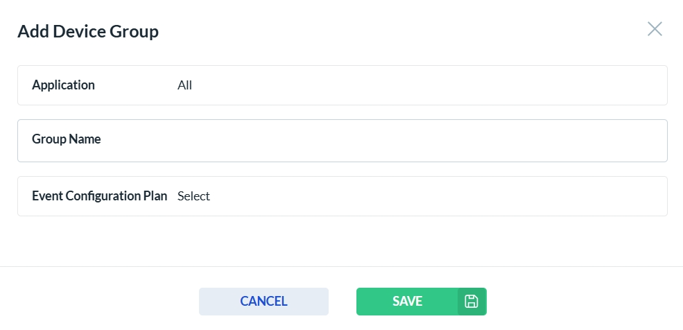 To add a new Device Group, click the Add New button. This will open the device group form. Select the Event Plan you want to associate with all devices in the newly created group. Complete all required fields, then click Save to create the new Device Group, or Cancel to discard your changes.
