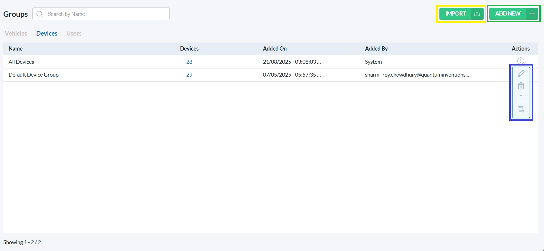 To edit a Device Group or view its audit trail or delete it, click on the corresponding icon in the Actions column (highlighted with a blue box).
