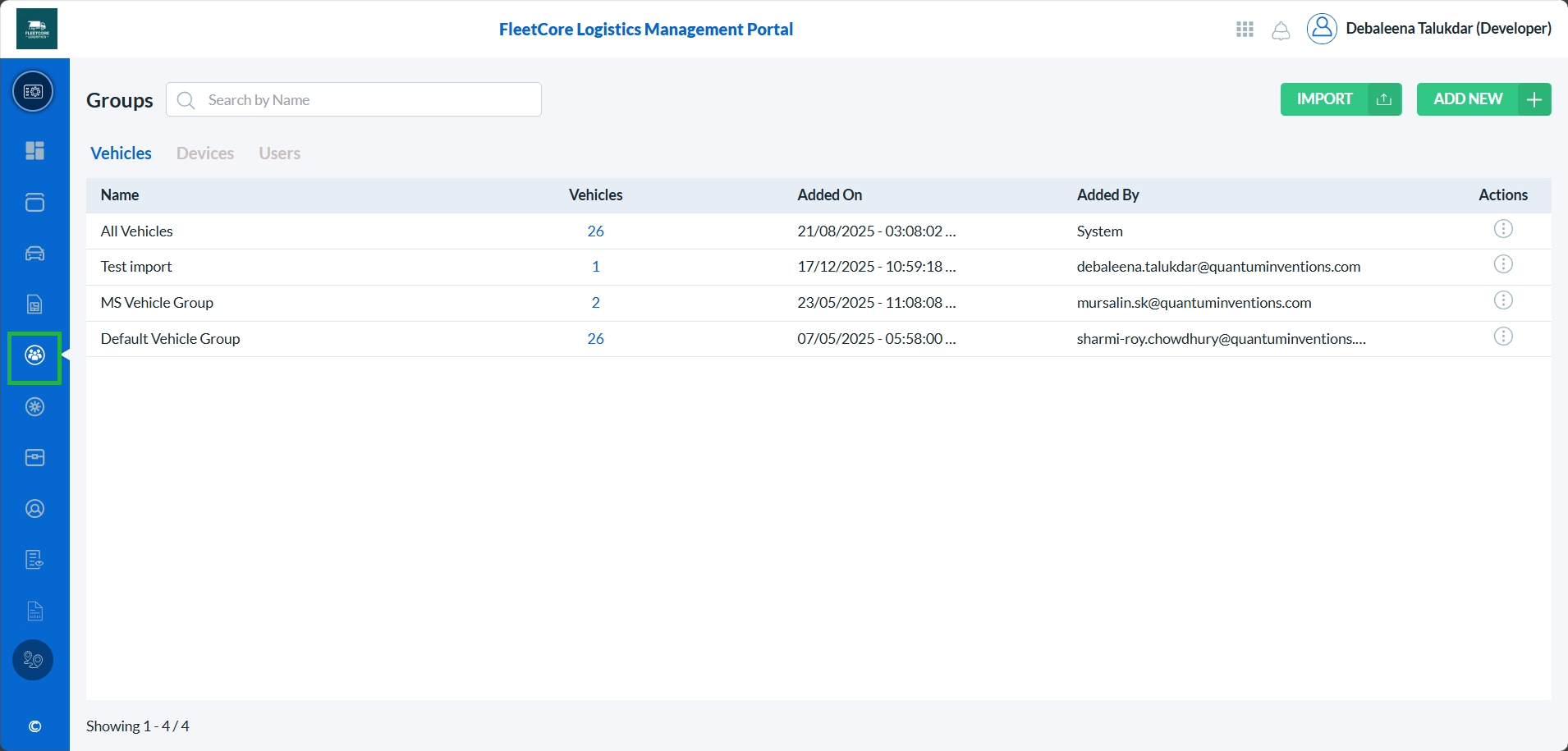 Vehicle Groups are listed in reverse chronological order — the most recently created Vehicle Group appears at the top.