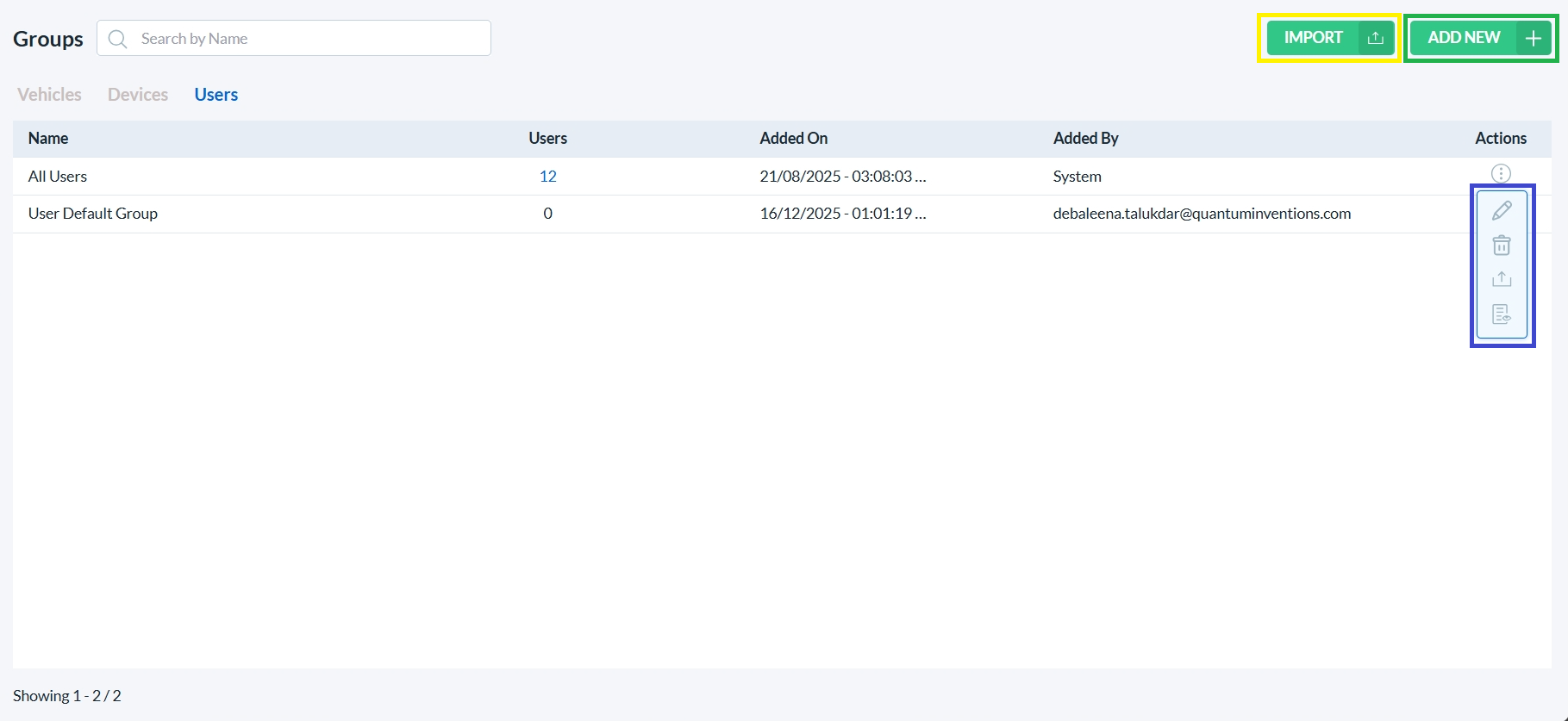 To import Vehicle Group, click on the Import button. (highlighted with a yellow box)