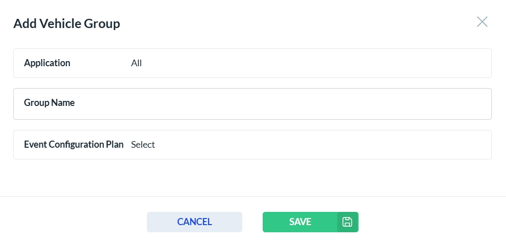 To add a new Vehicle Group, click the Add New button. This will open the vehicle group form. Select the Event Plan you want to associate with all vehicles in the newly created group. Complete all required fields, then click Save to create the new Vehicle Group, or Cancel to discard your changes.
