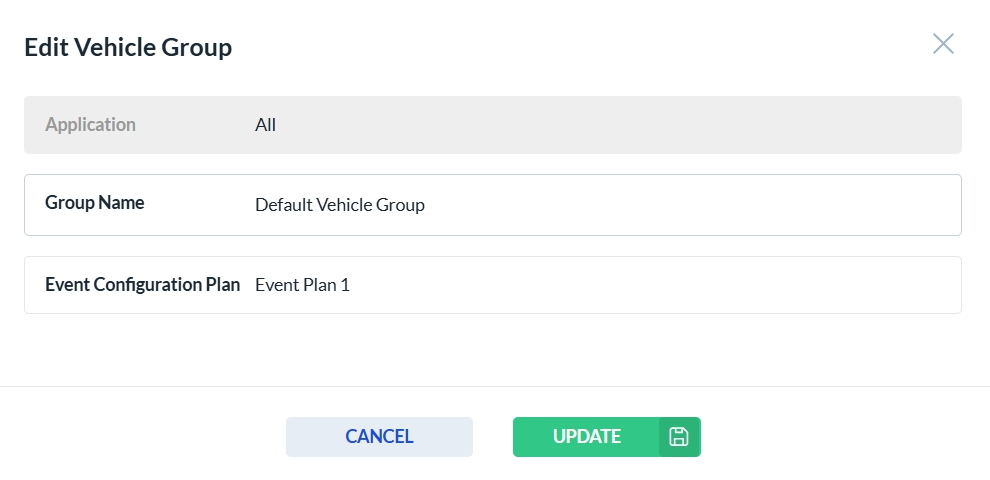 After clicking the edit icon in the Actions column, the Vehicle Group form opens. Only the fields that are enabled can be edited—disabled fields are read-only. Click Update to save your changes, or Cancel to discard them.