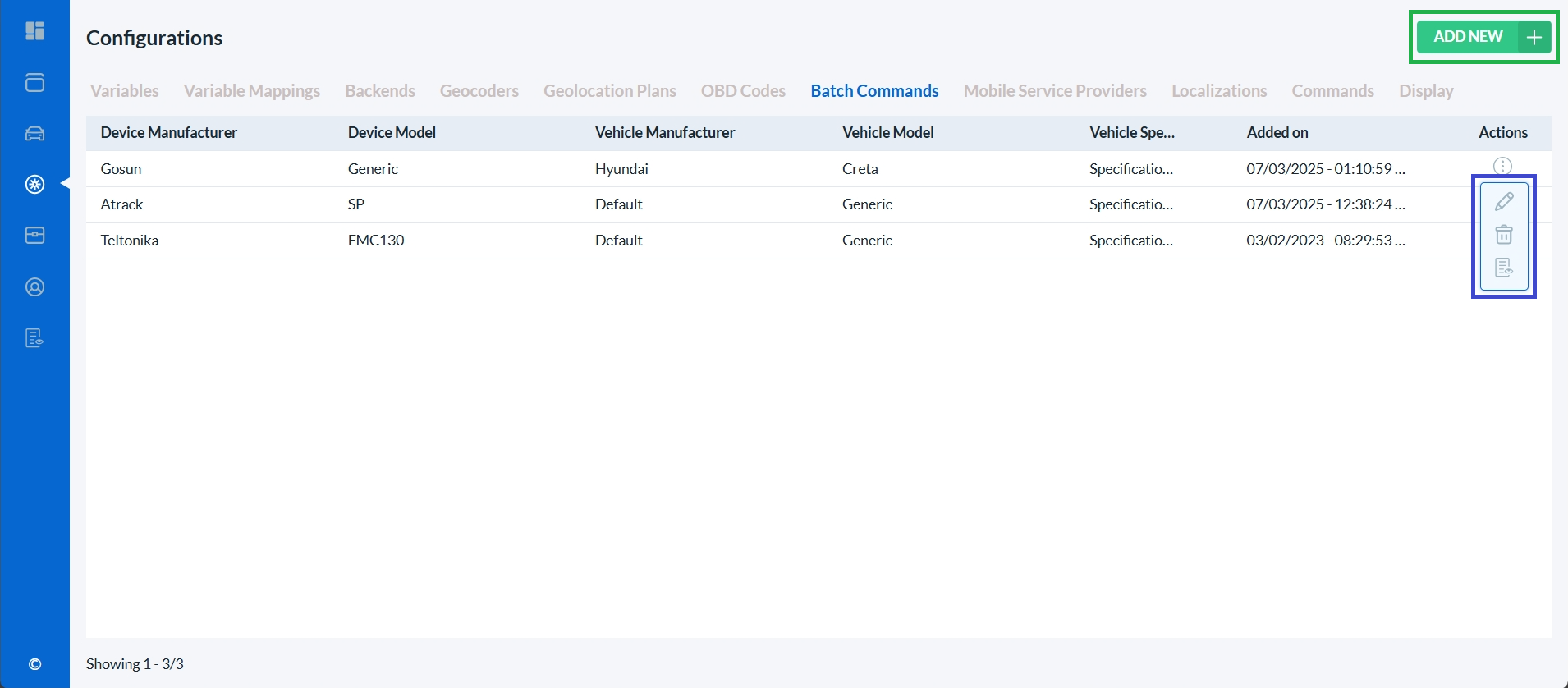 To edit a Batch Command or view its audit trail or delete it, click on the corresponding icon in the Actions column (highlighted with a blue box).