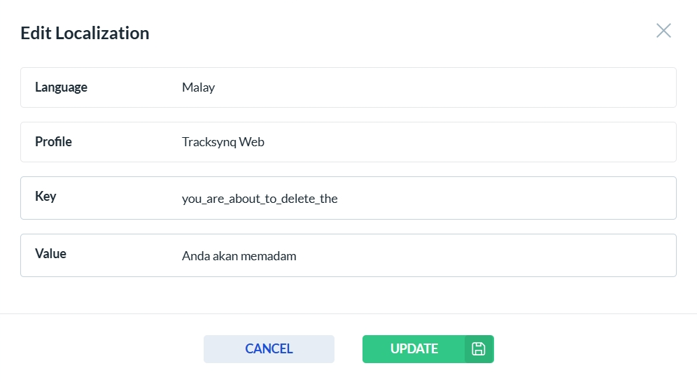After clicking the edit icon in the Actions column, the Localization form opens. Only the fields that are enabled can be edited—disabled fields are read-only. Click Update to save your changes, or Cancel to discard them.
