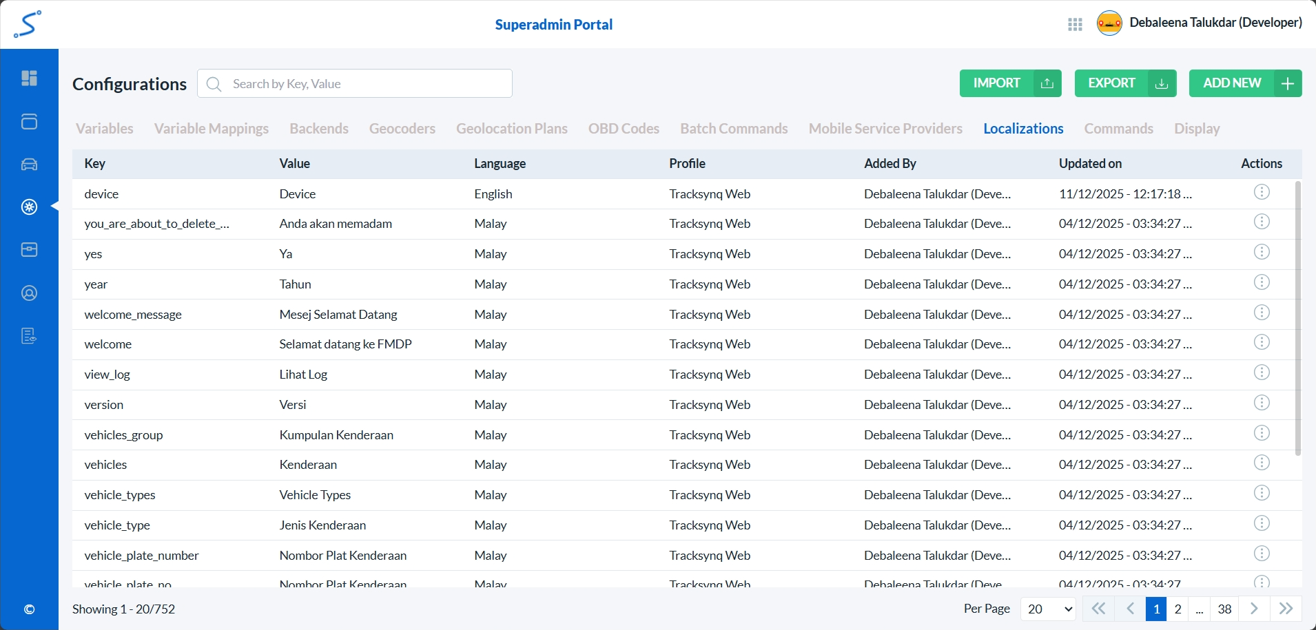 After logging into the Super Admin Portal, select Configurations from the left navigation panel and choose the Localizations sub-tab. This page allows administrators to view, create, manage, and delete the Localizations.