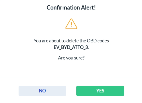To delete a OBD code, click the Delete icon in the Actions column. A confirmation dialog will appear. Click Yes to permanently delete the selected OBD code, or No to cancel the action.