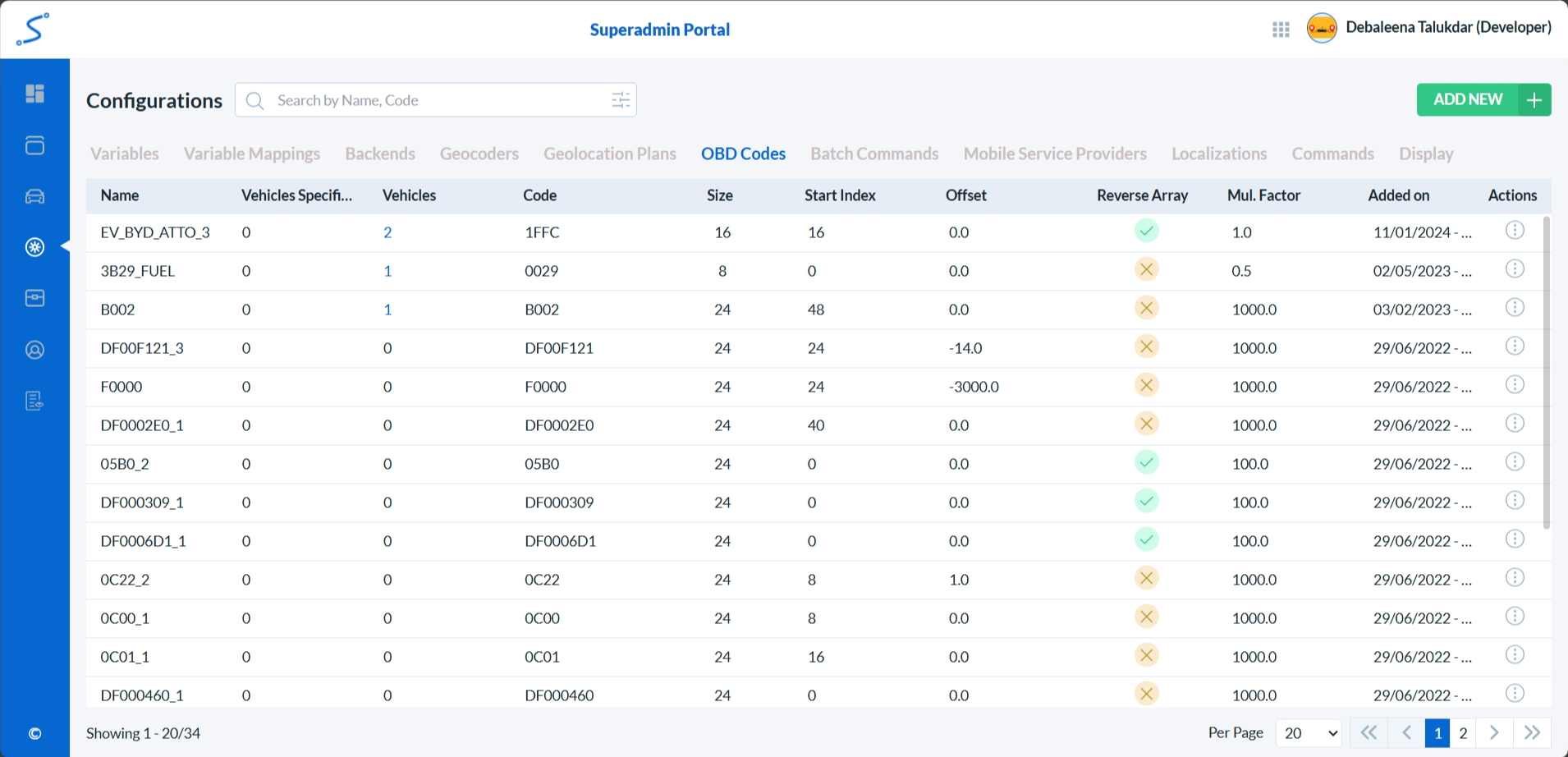 After logging into the Super Admin Portal, select Configurations from the left navigation panel and choose OBD Codes sub-tab. This page displays a list of all OBD codes along with their details.