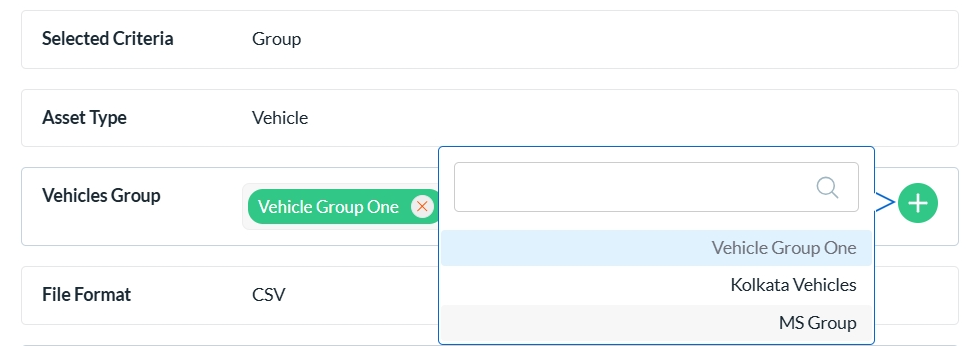 • Click the + button to select the relevant Device/Vehicle Groups or individual Devices/Vehicles, based on your choices for Selected Criteria and Asset Type.